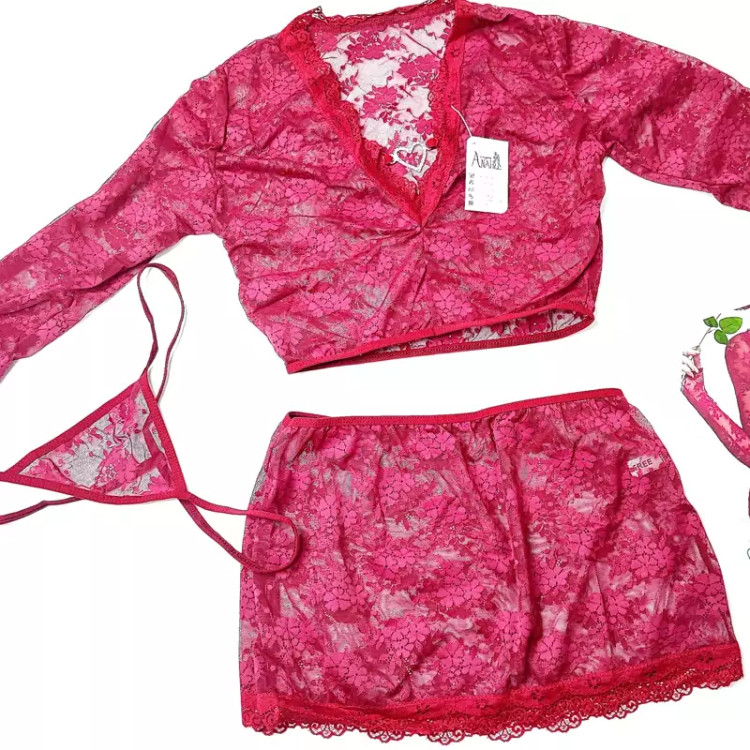 ست فانتزی گیپوری سه تیکه در قسمت جلو سنجاق سینه قلبی نگین دار ثابت داره کراپ تمام گیپور آستین دار دامن کوتاه گیپور شورت لامبادا دو رنگ زرشکی و مشکی دقیقا از خود محصول عکاسی شده و جزییات در عکس مشخص هست سایز بندی و رنگ بندی داره